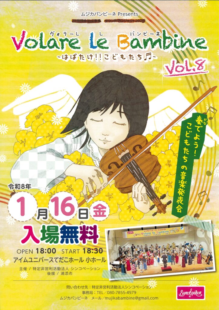 お知らせブログムジカバンビーネ Volare Le Bambine VOL.8 開催します。 2025年12月28日 年に一度の成果発表会です。今年度は助成金無しの自主財源での活動となり、ヴァイオリンを中心とした規模の演奏会となりますが頑張るこども達をプロ音楽家が情熱でサポートしてくださり開催までたどり着けそうです。令和8年1月16日(金)18時半開演 会場は アイムユニバースてだこホール小ホールです。皆様のご来場をお待ちしております。